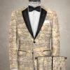 Featuring satin lapel, matching satin covered buttons, pants with satin stripes and gentle texture at its surface, our tuxedo is a subtle fashion-forward take on a traditional tailoring.