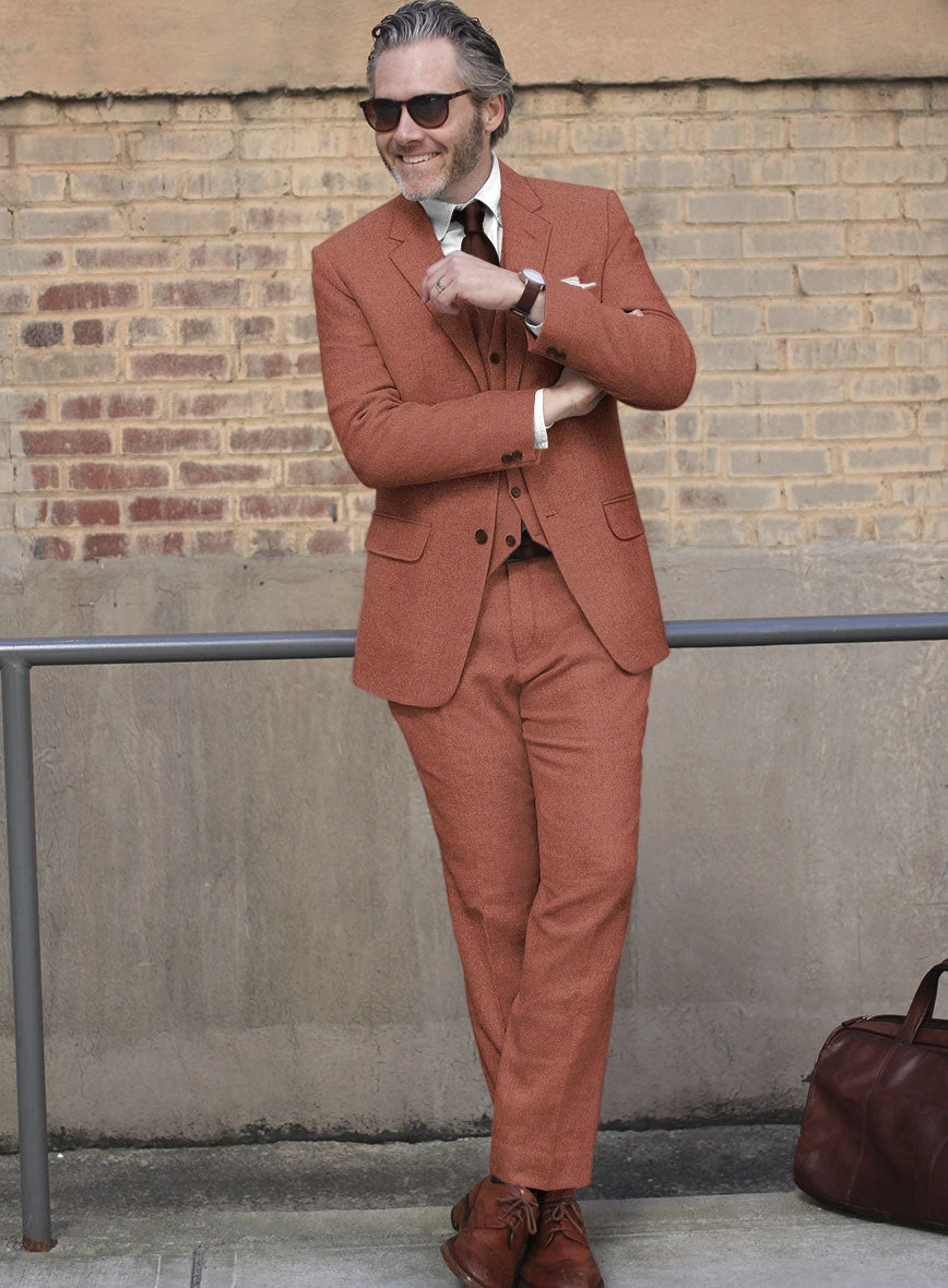 Although fashion trends may come and go, true style endures. Showcase your impeccable taste with our Naples Dark Salmon Pink Tweed Suit. Expertly crafted from premium wool fibers, it boasts a solid texture in a dark salmon pink colorway, which is often associated with vitality and perseverance. If you have a special occasion or a high-class party on the horizon, this suit is sure to make you the center of attention and elevate your formal wardrobe to the next level.