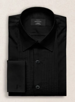 Create a timeless and elegant appearance. Our Pleated Black Tuxedo Shirt is a sophisticated choice for dress suits and tuxedos. Cut from the finest cotton, the shirt has a subtle luster and feel. Pleated bibs feature vertical pleats that run up both sides of the button placket and are a traditional detail on tuxedo shirts.