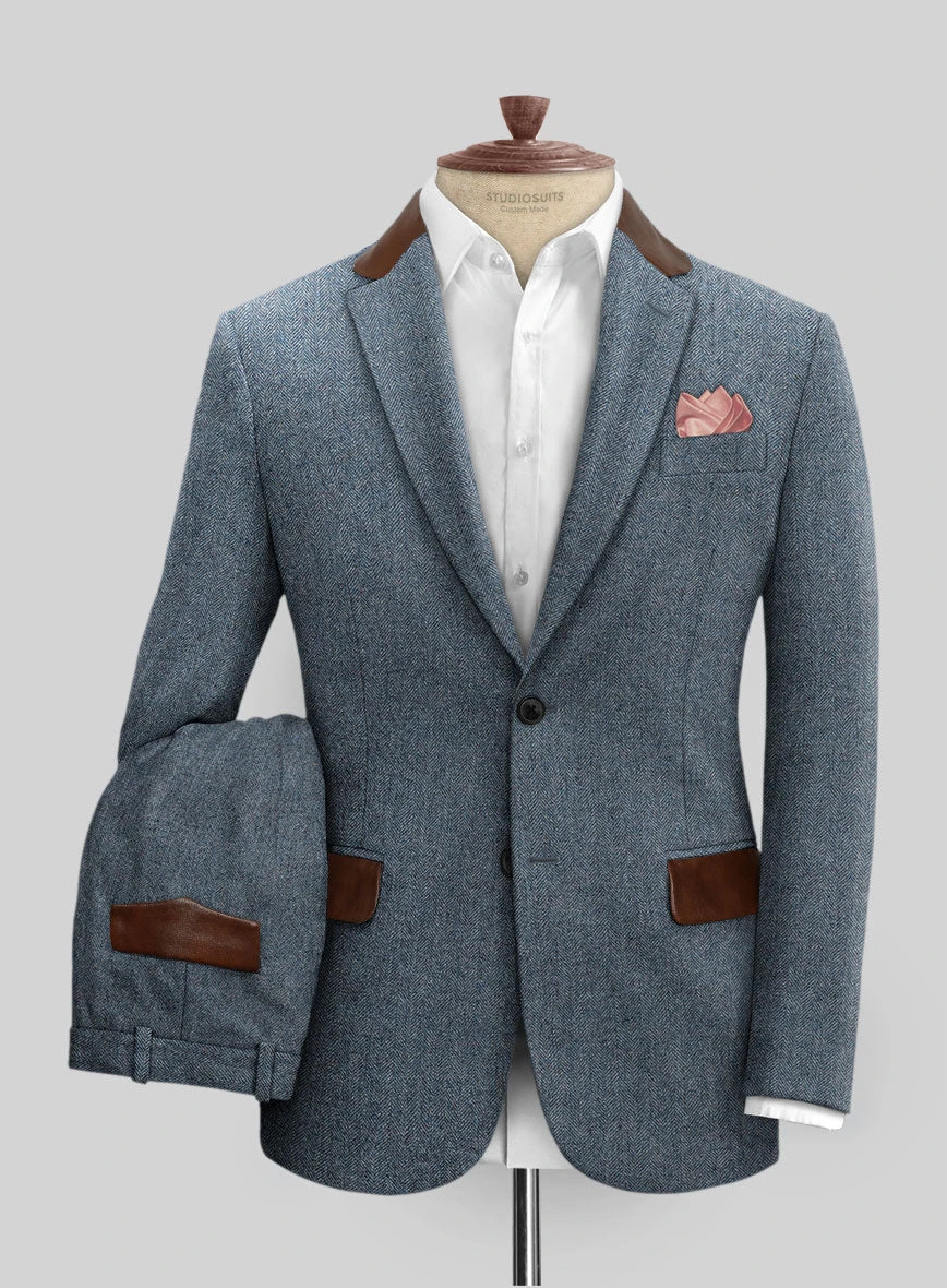 Vintage Herringbone Blue Tweed Suit with Leather trims on Jacket Collar & Flaps.
