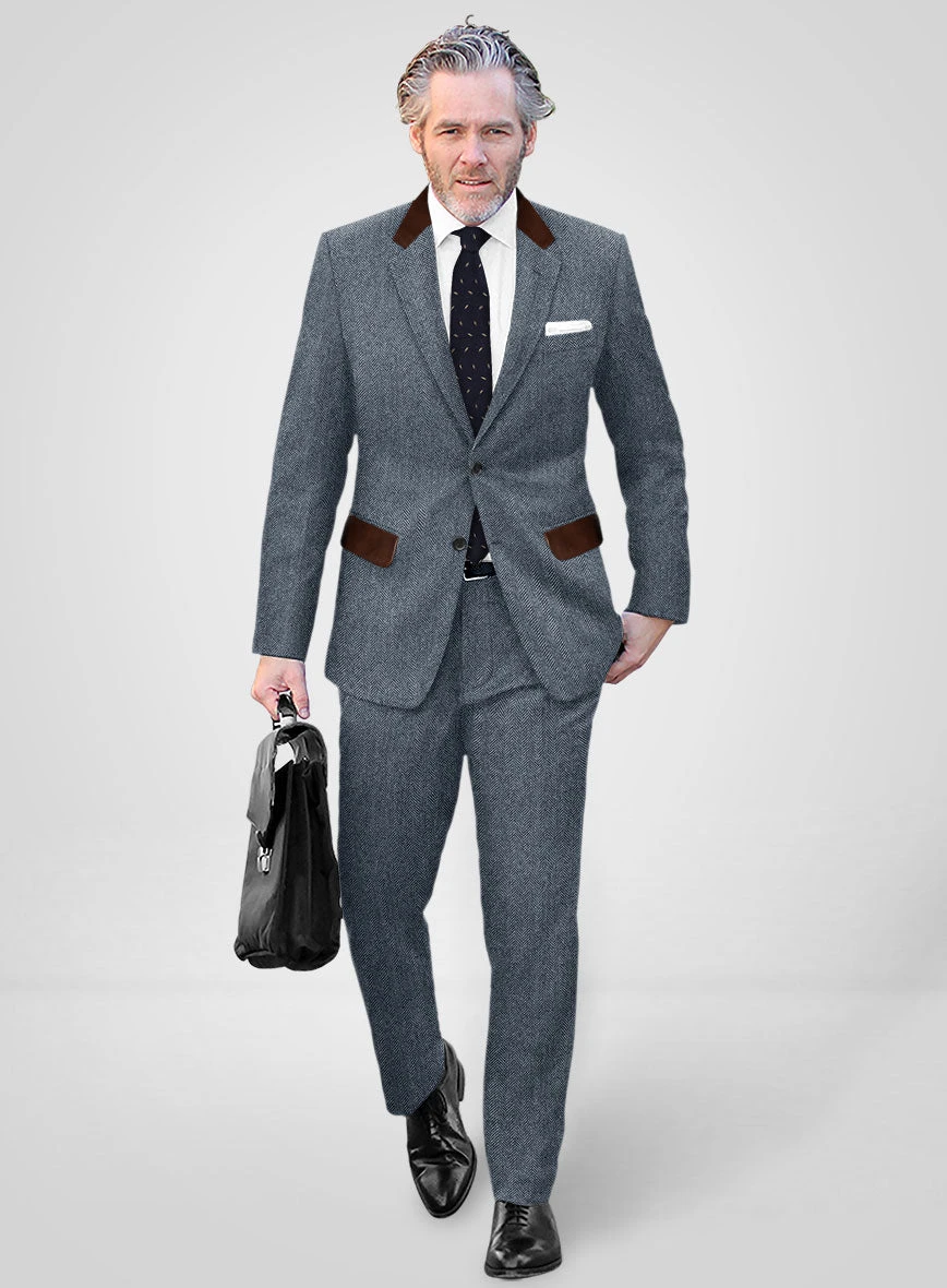 Both classic and versatile, our Vintage Herringbone Blue Tweed suit is surely going to take you through the seasons with stylish ease. Crafted from wool, this tweed suit is rich in quality and lends a distinctly bespoke edge which makes it a suave choice. Wear it with a matching waistcoat, a crisp white shirt, navy blue tie and black shoes.
