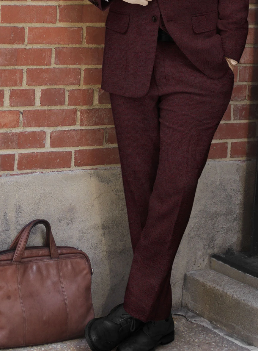 Be ready for business with our Wine Herringbone Tweed suit that offers an updated take on a tailoring essential. Crafted from wool, enhance your frame for a sharp look with this luxurious tweed suit which is designed from a tweed cloth that is woven with a classic herringbone style, surely a refined quality. For an effortless style this season, pair with a matching waistcoat, crisp white shirt and black derby shoes.